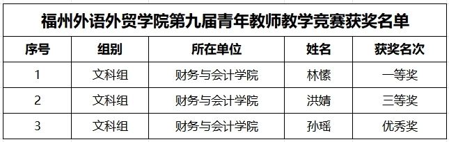 近日,福州外语外贸学院第九届青年教师教学竞赛圆满举行,经过激烈比赛,我院选派的资产评估系教师林愫荣获文科组一等奖,会计学系教师洪婧荣获文科组三等奖、孙瑶荣获文科组优秀奖。