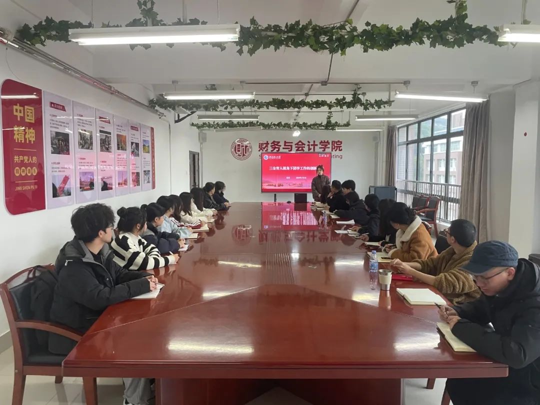 为加强校际交流与互动,提升团学工作,4月1日,福州外语外贸学院财务与会计学院邀请福建理工大学吴菲老师到院作《三全育人视角下团学工作的创新实践》工作经验分享主题讲座。学院全体辅导员、团学指导老师、团学部门学生代表共同参与。讲座由学院团委副书记刘佳佳主持。