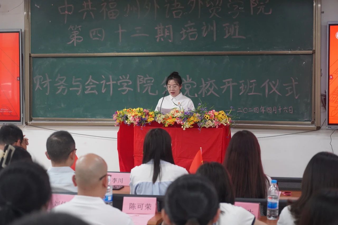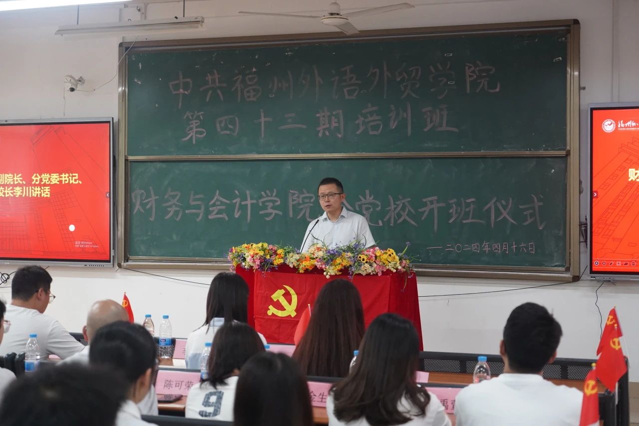 4月16日,福州外语外贸学院财务与会计学院分党校举行第43期入党积极分子培训班开班仪式。学院分党委书记、分党校校长李川,各党支部书记、全体辅导员以及第43期培训班学员参加仪式。仪式由学院分党委组织委员、学生第四党支部书记谢叶敏主持。