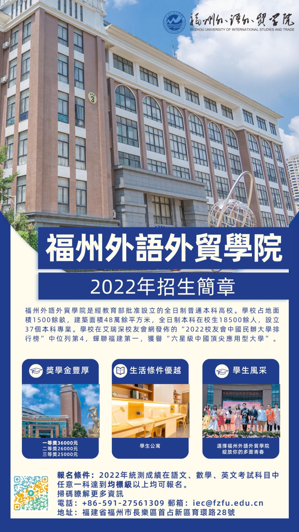 福州外语外贸学院2022年依据台湾统测成绩招收台湾学生简章