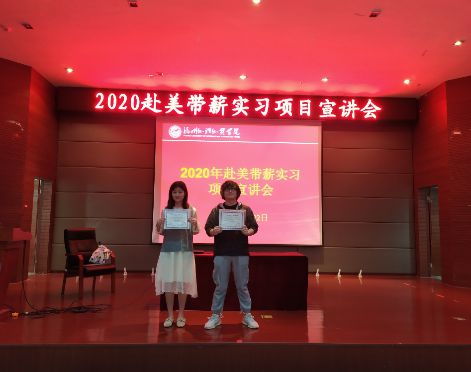 会上,项目方代表介绍了赴美带薪实习项目的背景及特点,并对报名流程及相关注意事项做了详细的说明。随后, 参加2019年赴美带薪实习项目的两位学员——2018级英语专业学生陈若滢、彭博就各自赴美期间的见闻、经历、成长及收获作了生动的分享,鼓励大家抓住机会,带薪体验美国文化。最后,项目方代表为上台分享的两位学员现场颁发了项目证书,表示肯定与鼓励。