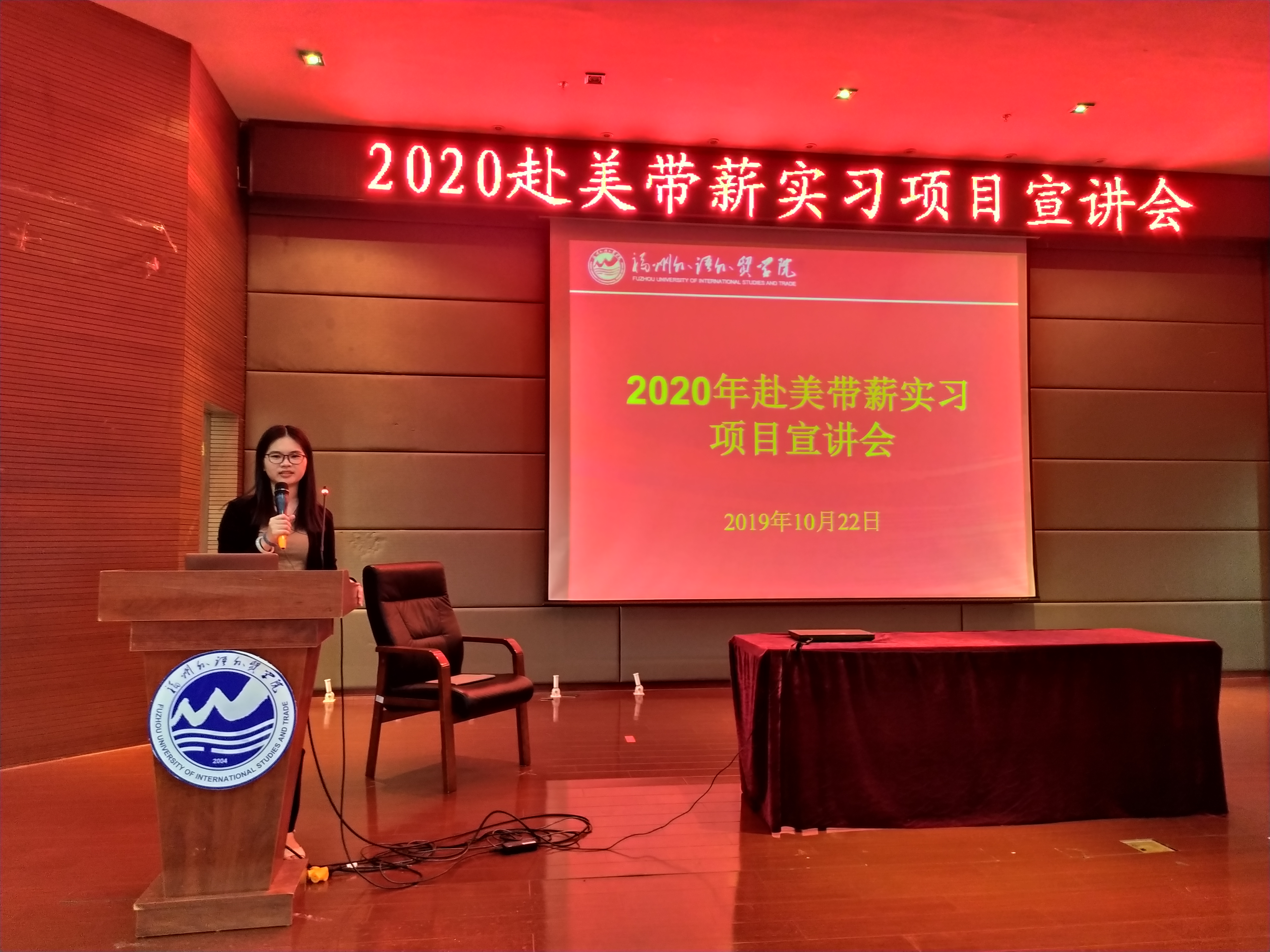 10月22日下午,我校举办2020赴美带薪实习项目宣讲会。宣讲会在学术报告厅举行,由国际教育中心相关同志主持,项目方代表及来自全校各学院的200多名意向学生参与了活动。