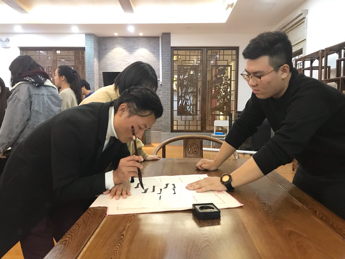 活动中,主持人向国际学生介绍了中国书法毛笔的起源,就新春字联书法,简述了其中蕴含的美好祝福与情谊。随后,书法协会成员展示了如何书写“福”字。在看完展示后,国际学生跃跃欲试,法协会成员耐心指导每一位国际学生汉字书写的执笔方法、点画、章法结构。