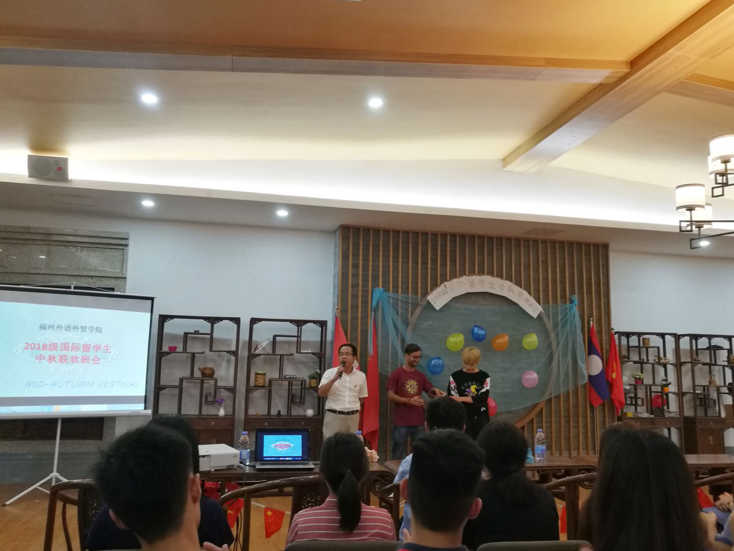 9月21日晚,福州外语外贸学院在中华文化体验馆举办2018级国际学生中秋联欢会。常务副校长黄建平教授,国际教育中心负责人,国际生素质教师,来自越南、尼泊尔、老挝、泰国的一百名国际学生以及来自我校精英班的中国学伴一起参加了活动。