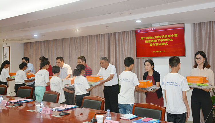 在闭营式上,大家一同观看了《福州外语外贸学院2018年致公学校学生夏令营掠影》短片,回味充实丰富的夏令营时光。最后,我校向夏令营全体学生们赠送了书包、运动鞋、运动装等礼品,并祝福他们开启人生新征程。