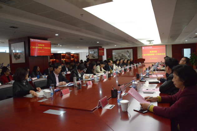 座谈会上,沈斐敏代表我校对黄灿一行的来访表示热烈欢迎。他向来宾介绍了我校近年来在教学改革、学科建设、科学研究、师资队伍建设等方面的办学成果和未来的发展规划。黄灿对我校的盛情接待表示衷心感谢。双方回顾了彼此深厚的渊源与友谊,希望继续密切交流,促进双方共同发展,为我国高等教育事业的发展做出积极贡献。会后,广西外国语学院各职能部门、二级学院就不同业务需求与我校各单位展开细致的对口交流。