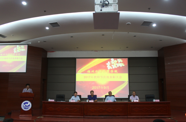 庆祝表彰大会在庄严的国歌声中拉开帷幕。校党委书记陈炳钦宣读获得2017年“师德之星”、2016-2017学年“校长嘉奖令”、2015-2017年度福建省优秀教育工作者、2017年福州外语外贸学院教师教学优秀奖名单。校领导为上述先进个人颁奖。