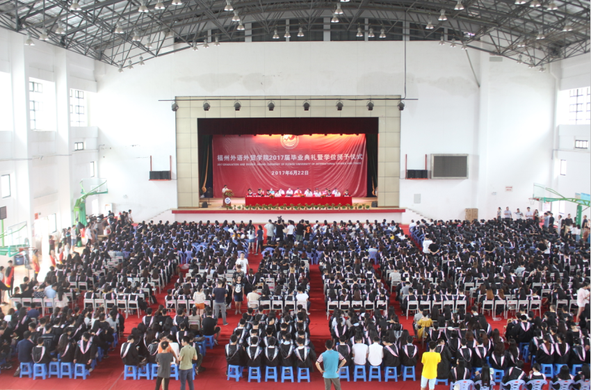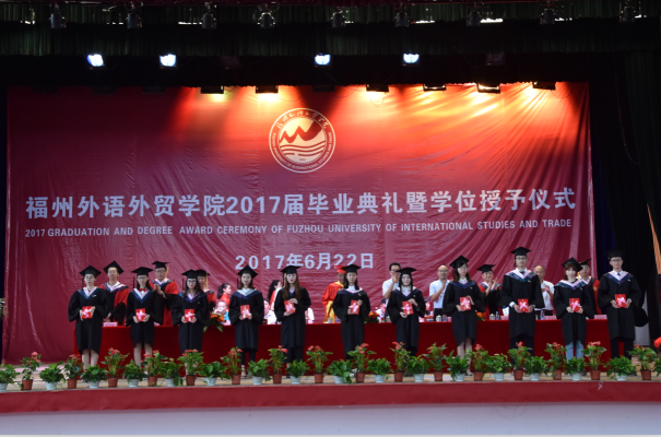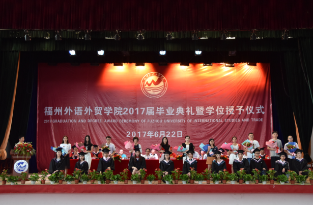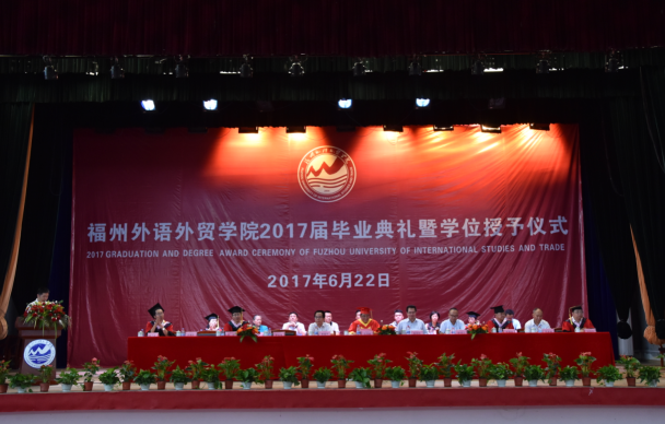 校学位评定委员会主任、博士生导师、校长沈斐敏教授在典礼上致辞。他向2017届全体本科毕业生致以最热烈的祝贺。他说,同学们学有所成,并即将开启全新的旅程,作为校长、作为老师,他倍感欣慰。四年光阴,成就了学子们苦读后的本领与才华,更凝聚着父母、老师的关爱与支持。 他叮嘱同学们始终怀有一颗感恩的心,不辜负这份厚爱与期望。作为校长,更作为长辈,他希望即将踏入社会的毕业生们做一个心中有爱、与人为善、才德兼备的人。要怀“善心”,做到心中有爱,这将体现你们的涵养;要讲“善言”,做到与人为善,这将体现你们的宽容;要践“善行”,做到才德兼备,这将体现你们的修为。做到这些,你们便可大胆地跨出福外的大门,勇敢肩负起时代赋予的重任,实现习总书记的重托——志存高远、德才并重、情理兼修、勇于开拓,做一个无愧于福外,无愧于国家,无愧于时代的有价值的人!让有梦想、有信念、有奋斗、有奉献的人生,更有意义!他希望同学们把人生的理想融入到国家和民族的事业中,为实现中华民族伟大复兴的中国梦,努力奋斗!为我们伟大祖国的未来和属于我们共同的光荣与梦想,铿锵前行!为“与人民一道拼搏、同祖国一道前进、服务人民、奉献祖国”的远大志向,砥砺奋进!他叮嘱同学们,也要记得,常回家看看。不管大家走得多远、身在何处,福外永远是同学们的精神家园。他将和你们亲爱的老师一道,静候同学们,佳音频传。