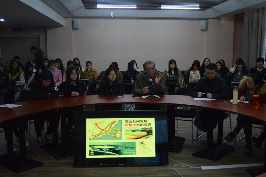 林祥生教授分析闽台共同发展跨境电商的机遇,从最基本的物资搬运、物流加值服务、物流及商流服务、整合金流资讯流等方面分析闽台合作跨境电商的海空中转效益,并从台湾的角度分析闽台合作海空中转的优劣势,以及所要面临的机遇和挑战。林祥生教授还与到场师生展开交流互动。