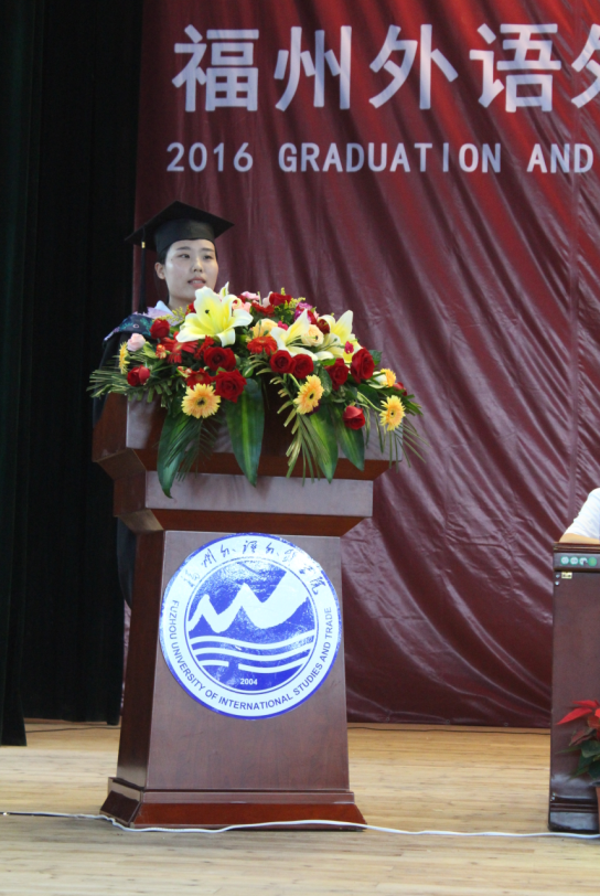 沈斐敏在典礼上致辞。他首先向2016届全体本科毕业生致以最热烈的祝贺。他说,同学们学有所成,并即将开启全新的旅程,作为校长、作为老师,他们倍感欣慰。四年光阴,成就了学子们苦读后的本领与才华,更凝聚着父母、老师对你们的关爱与支持。他叮嘱同学们始终怀有一颗感恩的心,不辜负这份厚爱与期望。作为校长,更作为长辈,他希望即将踏入社会的毕业生们做一个德才兼备的人:要怀“善心”,做到心中有爱,这将体现你们的涵养;要说“善言”,做到与人为善,这将体现你们的宽容;要践“善行”,做到德才兼备,这将体现你们的修为。做到这些,便可大胆地跨出福外的大门,勇敢肩负起时代赋予的重任,志存高远、脚踏实地,放心去追寻心中的梦想。他叮嘱同学们,也要记得常回家看看,保持与母校的联系。他和母校老师们一道,静候你们佳音频传。最后他祝福学子们乘风破浪,前程似锦!在未来的日子里幸福、快乐!