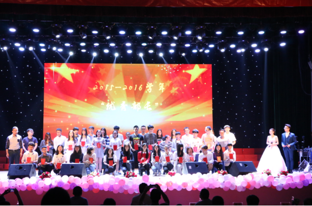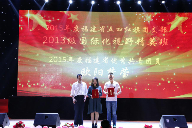 晚会每个篇章以表彰先进开篇。晚会期间表彰了荣获2015年“福建省五四红旗团支部”的13级国际化视野精英班和荣获2015年“福建省优秀共青团员”的欧阳梦莹同学;表彰了我校2015-2016学年“优秀共青团员”526名、“优秀共青团干部”167名、“优秀部门”39个、“优秀部长”40人、“优秀创业团队”5个、“优秀俱乐部”5个、“十佳社团”10个、“十佳职涯项目”10个、“五四红旗团支部”31个、“五四标兵团支部”1个、“五四红旗团总支”4个。