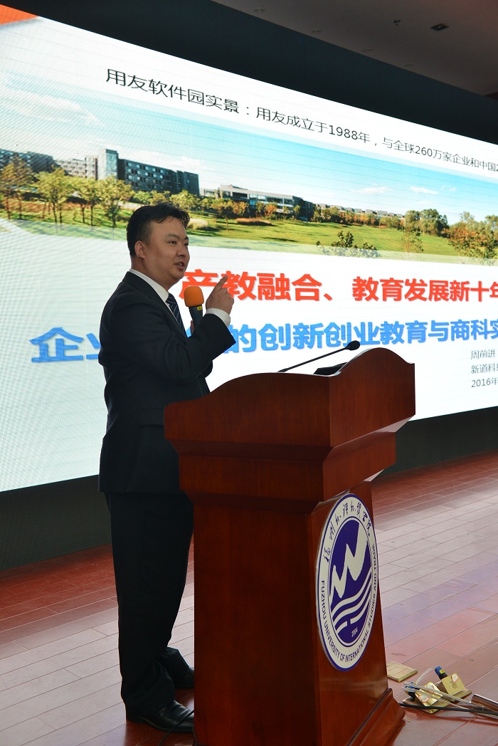 我校党委副书记、校长助理徐国立副教授发表致辞,他回顾学校的办学历程,指出我校作为一所应用型本科高校,始终坚持“紧紧围绕现代服务业发展需要,培养具有国际化视野和创新精神的高素质应用型人才,为海峡西岸经济社会发展服务”的办学定位,注重结合地区经济发展,倡导产教融合、实践育人,培养应用型、创新型人才。我校与新道科技股份有限公司福建分公司合作,是探索实践教学模式,创新校企合作体制的有益尝试,也为大学生创新创业基础教育夯实了基础。