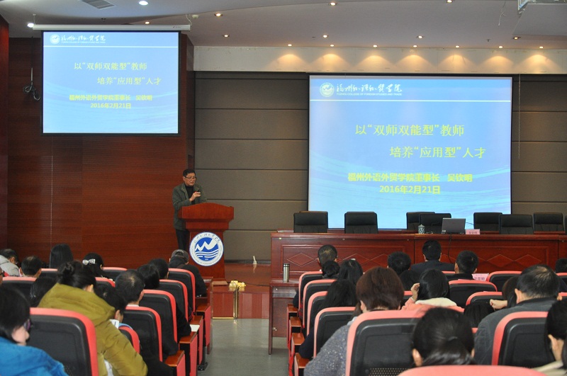 2月21日,吴钦明董事长为教职员工做《以“双师双能型”教师培养“应用型”人才》的报告。我校领导班子及各职能中心负责人、各系(部)负责人及相关教师听取了报告,报告由校长沈斐敏教授主持。