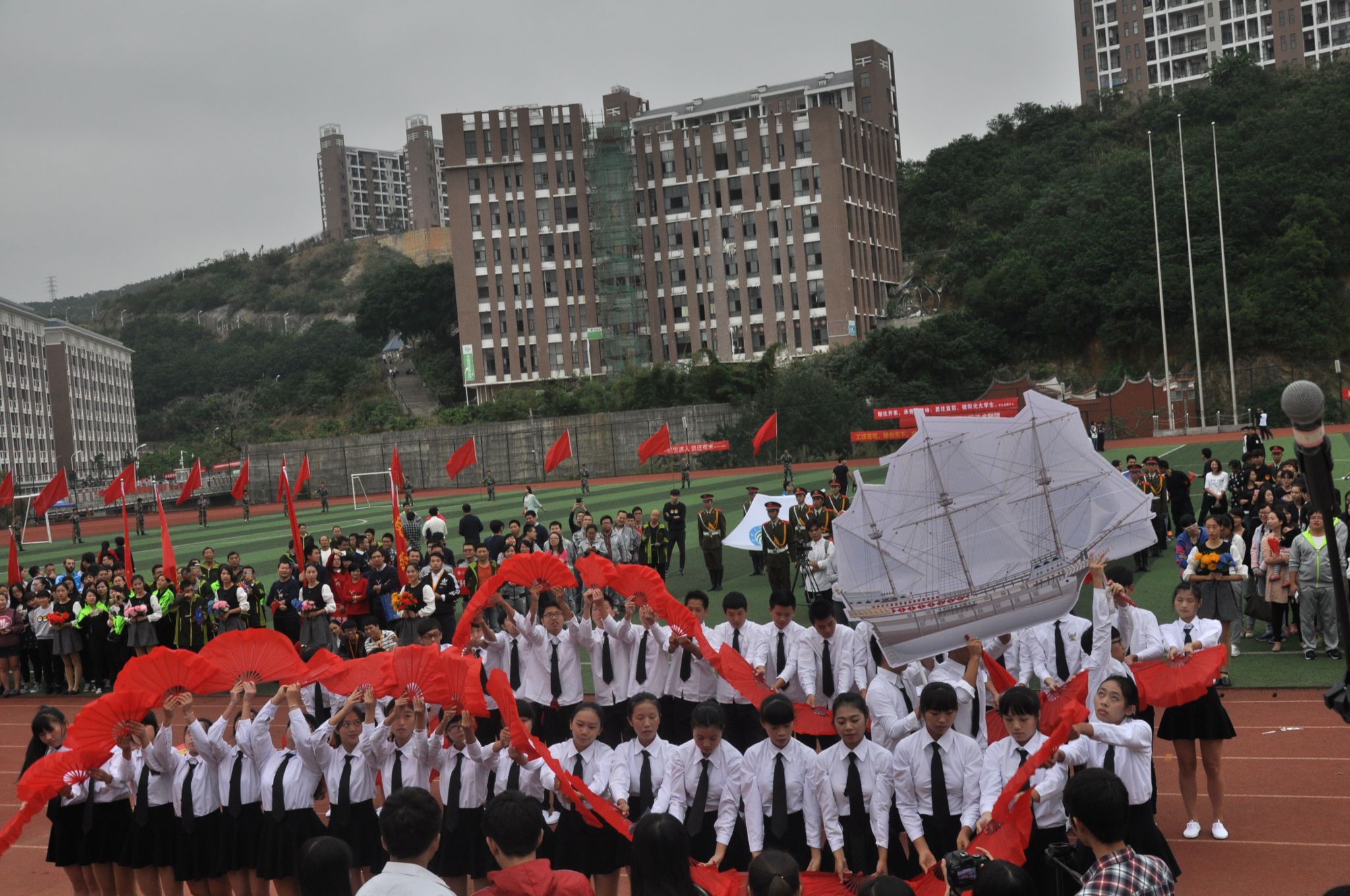 【经贸系】表演方阵组成海浪状,同学们举帆船穿行而过,不仅象征对学校的祝福:顺水行舟,福德涛涛,