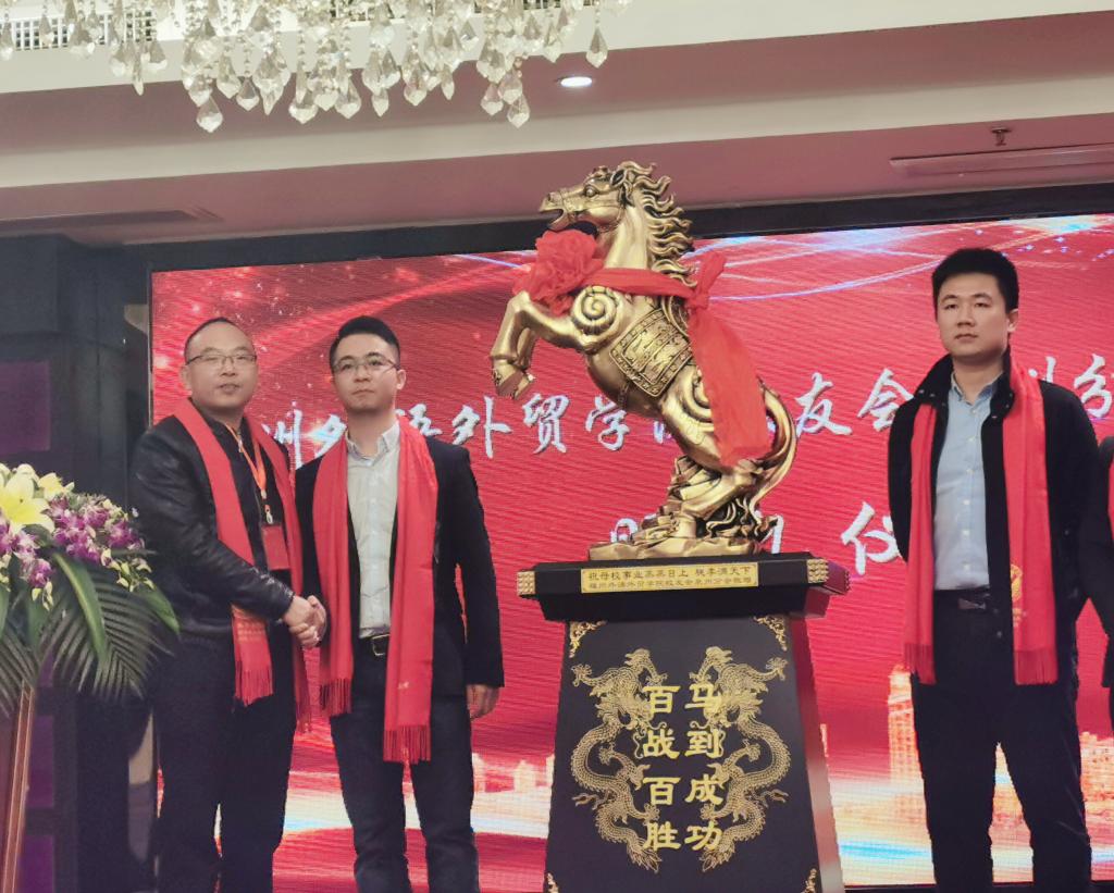 2007届校友郑敏惠、2012届校友池昌波分别代表校友会福州分会、校友会厦门分会上台致贺词,他们先后对泉州校友分会的成立表示热烈祝贺。李荣聪代表校友会泉州分会理事会发言,他表示,泉州的广大校友始终以福外为荣,时时刻刻关注着母校的发展,母校的每一次变革和进步,都牵动着每一位校友的“思校之情”。在广大校友的携手并进和共同努力下,校友会事业一定能办出特色、干出实效,为母校的建设发展添砖加瓦、贡献力量。随后,李荣聪代表泉州校友向母校赠予寓意“百战百胜、马到成功”的吉祥马,祝福母校事业蒸蒸日上,桃李满天下。