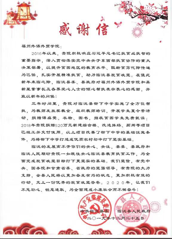日前,我校收到甘肃省定西市临洮县委县政府发来的感谢信,对我校积极响应习近平总书记扶贫必扶智的重要指示精神,深入贯彻落实党中央开元网页版东西部扶贫协作的重大决策部署,扎实开展教育精准扶贫,助力临洮县脱贫攻坚表示衷心感谢,并致以新年问候。