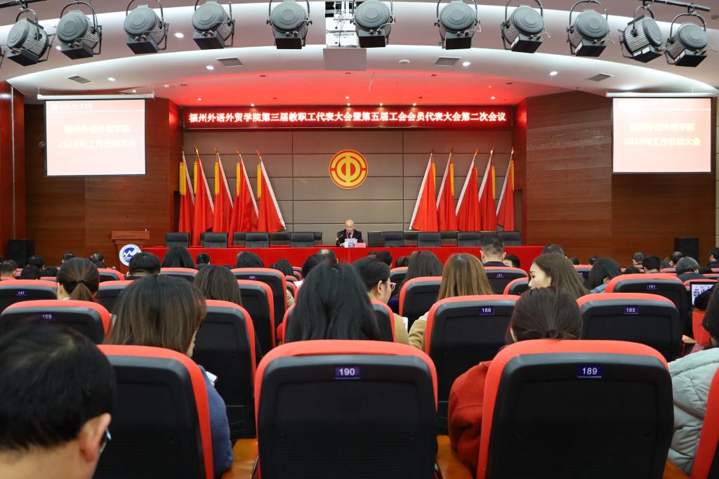 黄建平主持第一次全体会议。许明代表福州外语外贸学院校务委员会向大会作学校工作报告。报告回顾了学校一年来取得的成就。指出,一年来,学校在齐心协力推进高质量发展,取得国家级科研立项零的突破、国际经济与贸易专业获批国家级一流专业建设点、物流管理专业获批省级一流专业建设点、20项“金课”获批省级金课、在校友会2020中国民办大学排名中连续两年位居全国第十五名、蝉联福建省第一名等方面取得可喜成就,报告从抓好建校十五周年系列活动、出台学校高质量、特色发展规划两件大事,以及学科专业建设、教育教学工作、科学研究、人才培养、学生管理、人才队伍建设、开放办学、资源保障建设、行政管理规范化建设、校园文化和美誉度建设等九个方面全面总结了2019年学校的主要工作。他指出,要准确把握新形势,适应新常态,迎接新挑战,实现新发展。对标高质量,全面推进2020年各项工作。要继续深化内部治理体系改革,激发发展活力;统筹推进学科专业建设,提高核心竞争力;全面提高办学水平,提升高质量发展保障力。指出要坚持以习近平新时代中国特色社会主义思想为指导,继续贯彻党的教育方针,坚持社会主义办学方向,落实立德树人根本任务,在董事会领导下全面推动应用型转变建设,不断深化体制机制改革,持续推动学校内涵式发展,为建设优势突出、特色鲜明、机制灵活,位居全国同类院校先进行列的高水平应用型大学而努力奋斗。
