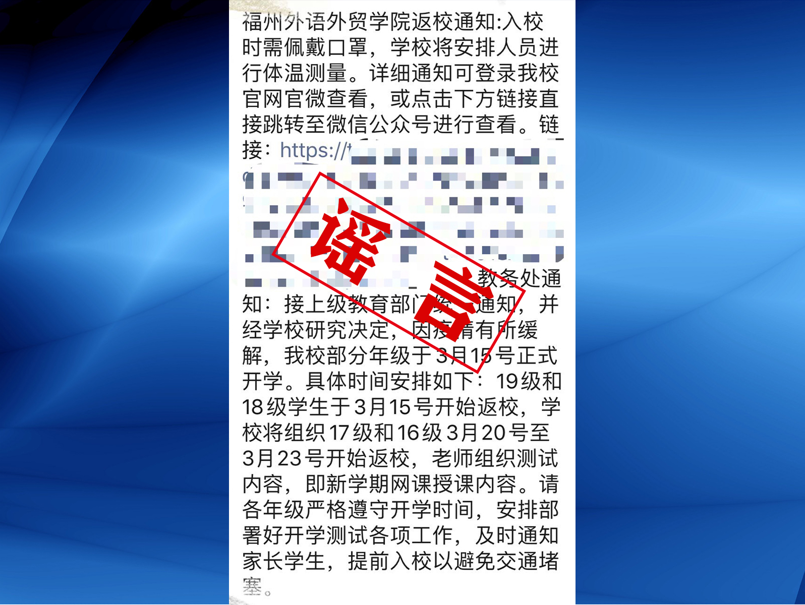 近日,网上发现“福州外语外贸学院返校通知”,消息显示我校2020年春季开学时间已经确定,并附有链接。经查核,该消息为虚假消息,请广大师生家长千万不要轻信,且务必不要点击消息中的链接,谨防个人隐私泄露。