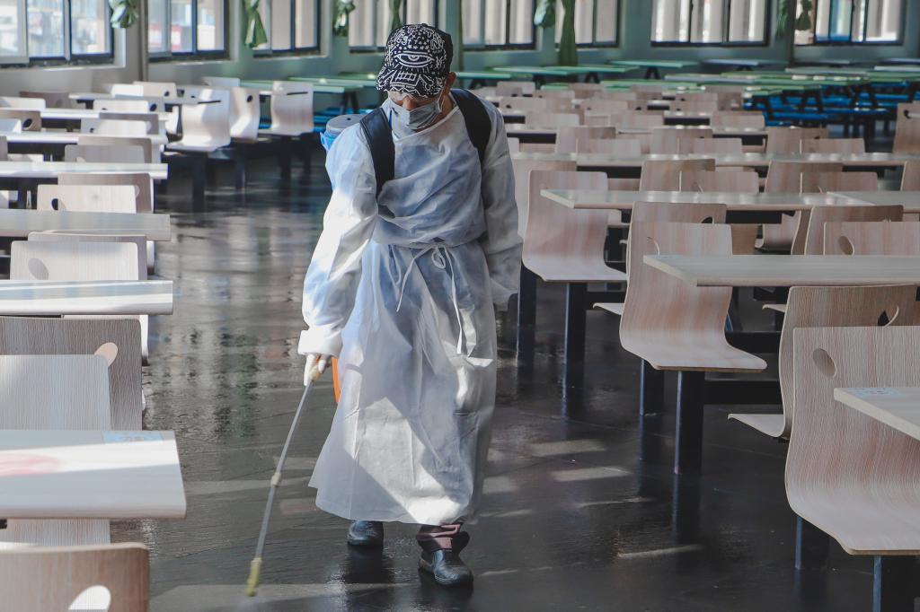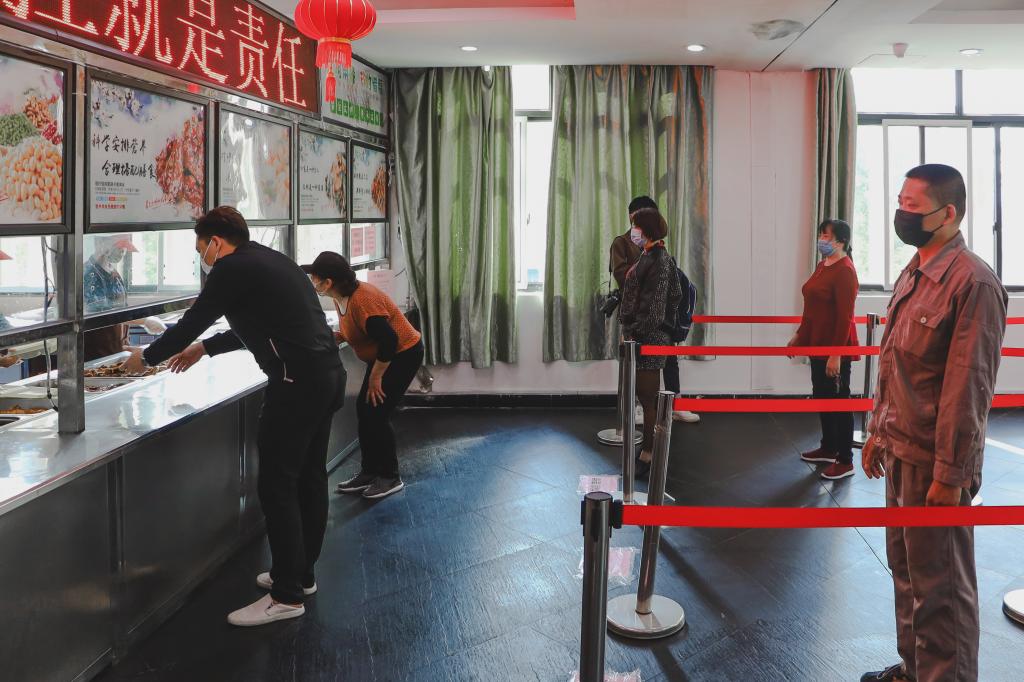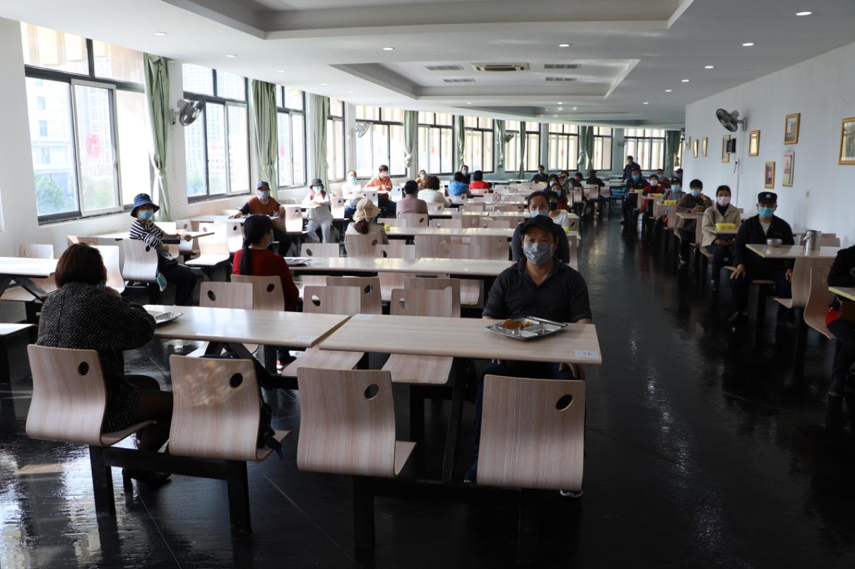 开学后学生进入食堂体温检测异常场景模拟演练在教工食堂进行,学校多个部门共同协助完成开餐演练,30余参演人员模拟学生身份参加演练。食堂入口处,工作人员查验学生身份和体温同时控制进入食堂的人流量,学生进入食堂后按标识进行手部消毒后就餐等。就餐演练分别针对“全部学生自备餐具取餐带回”和“部分学生堂食,部分学生自备餐具取餐带回”两种就餐方式进行,餐厅内实行一人一桌同向就餐,进行就餐过程及餐后消毒全流程模拟。