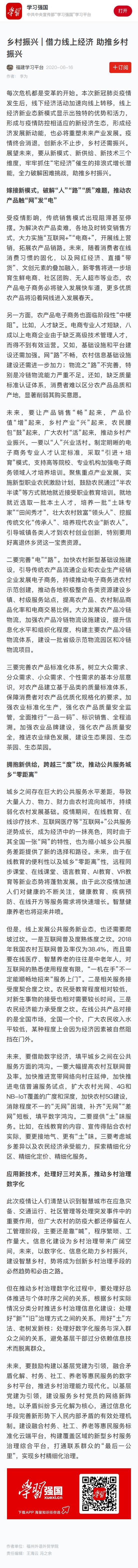 6月16日,中宣部“学习强国”平台刊载我校福建致公经济研究院院长李为教授撰写的理论学习文章《借力线上经济 助推乡村振兴》。该文是福建致公经济研究院充分发挥致公党福建省委平台支撑和福州外语外贸学院智库优势,围绕乡村振兴取得的又一成果。