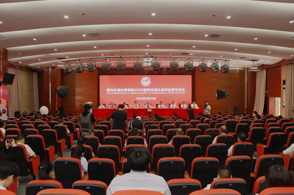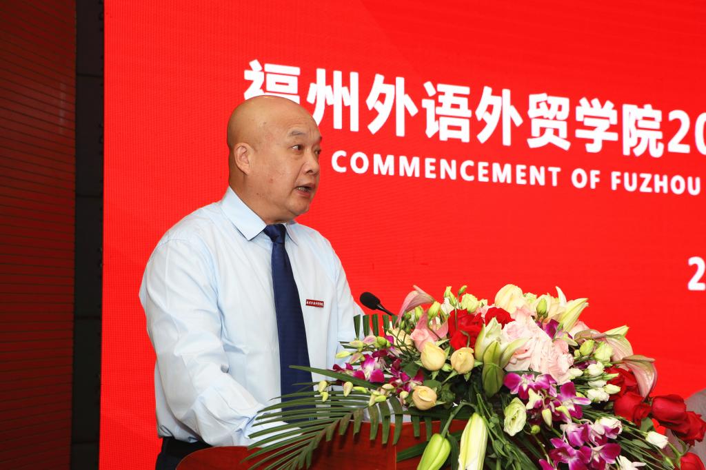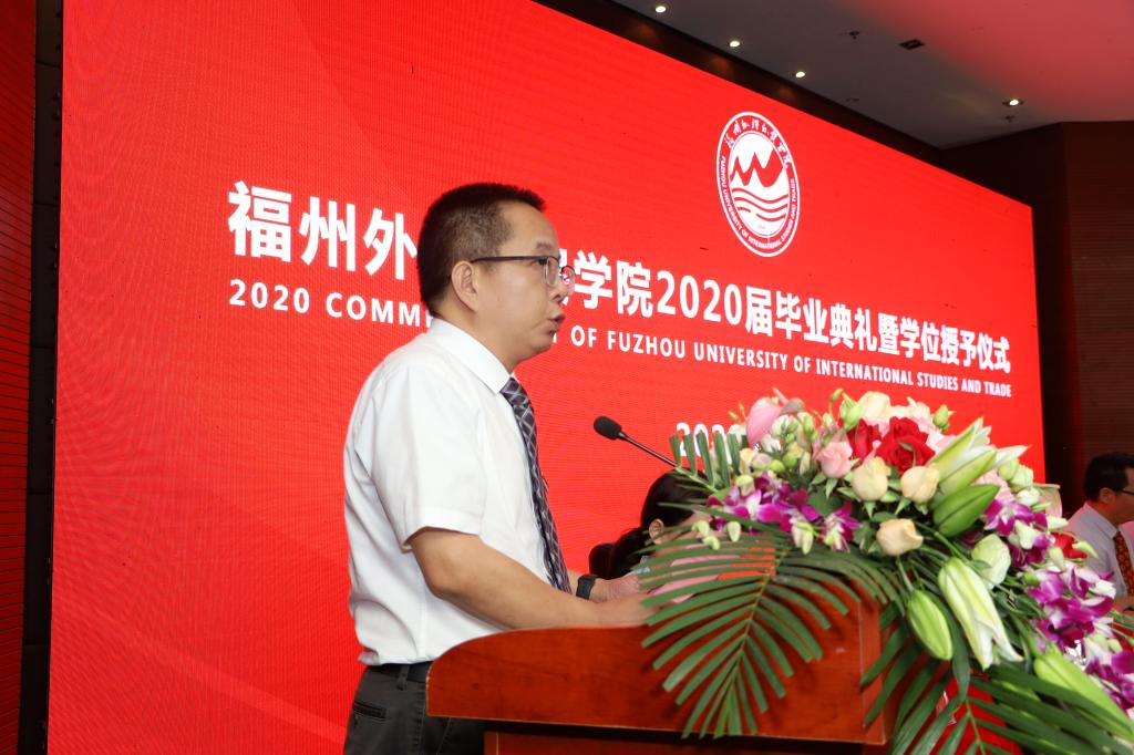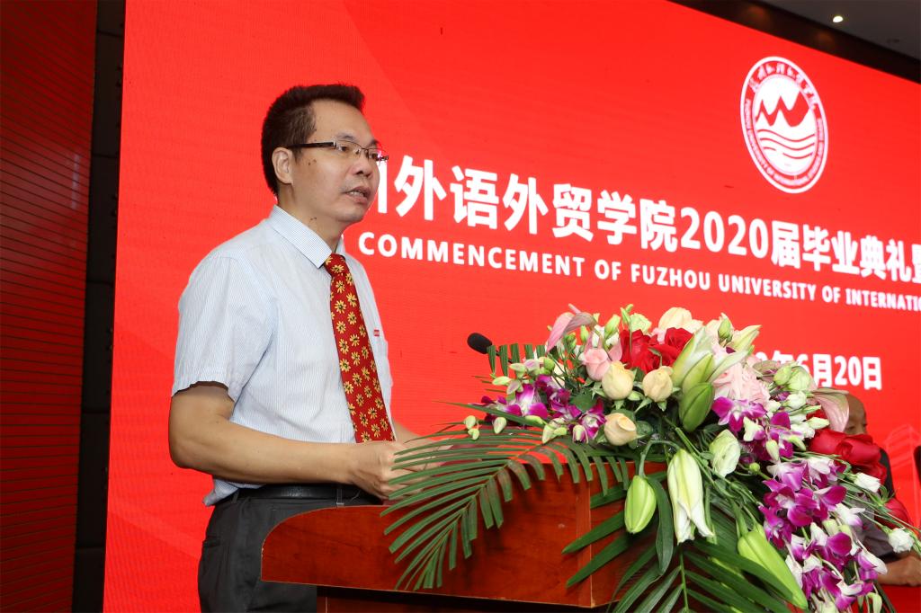 校学位评定委员会主席、博士生导师、校长许明教授向2020届毕业生表示热烈祝贺,他带领大家回顾了四年间同学们和福外共同的成长历程,勉励同学们在新时代里,拥抱变化,脚踏实地,厚积薄发,与时代同步伐、与人民共命运,在奋斗中实现人生价值。他代表学校承诺今后学校每年的毕业典礼均会为今年未返校参加毕业典礼的毕业生虚位以待,让每位毕业生不留遗憾。