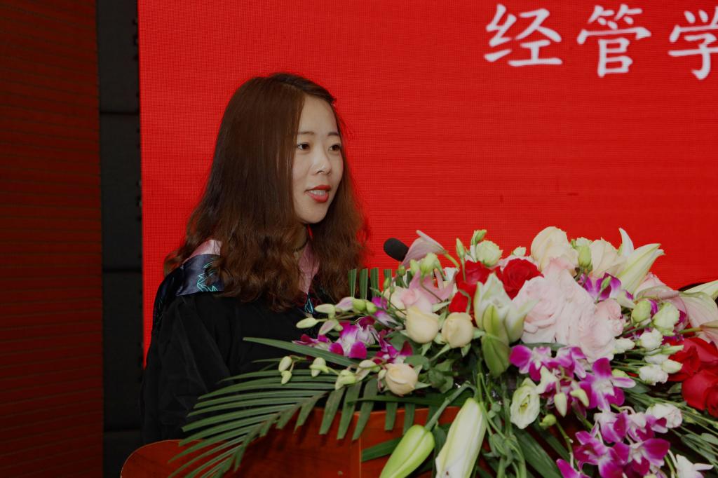 经管学院肖碧云老师作为教师代表发言,向2020届毕业生顺利毕业表示热烈祝贺,她希望毕业生们能胸怀天下,脚踏实地,奉献社会,无论在什么样的岗位,都要时刻不忘继续学习,不要放弃曾经的梦想。