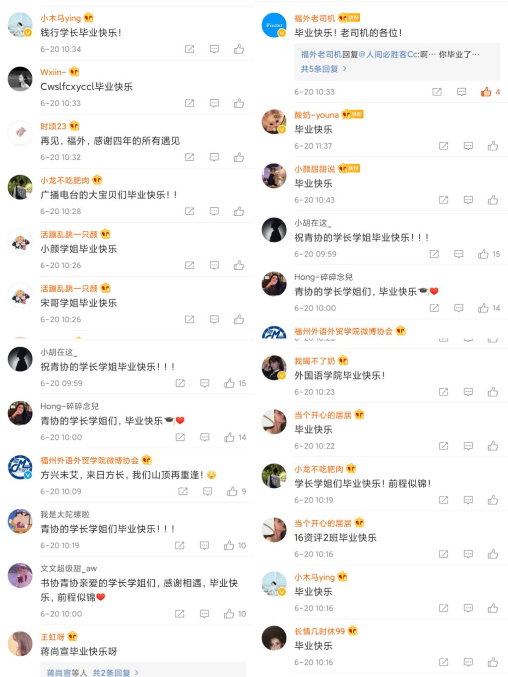 福外四年的时光对最初的我们来说,也许看起来像是一条漫漫长路,但是等到一切结束,再次回首,却又如此短暂。曾经的毕业季我们只是看客,如今的毕业季我们已是主角。特殊时期我们不能相聚一堂,但温柔有爱的学校为了弥补我们这届毕业生些许的遗憾,给我们定制了别具情怀的云毕业典礼,真心感受到了福外对我们的款款情谊!在难忘而美好的大学时光里,我收获了知识,收获了友情,收获了人生当中一份份的成熟与自信。即将和母校告别,有太多的不舍,有太多的难忘,身为福外学子,我真的很幸福。相逢又告别,归帆又离岸,愿我们不负青春,扬帆逐梦,归来仍是少年!