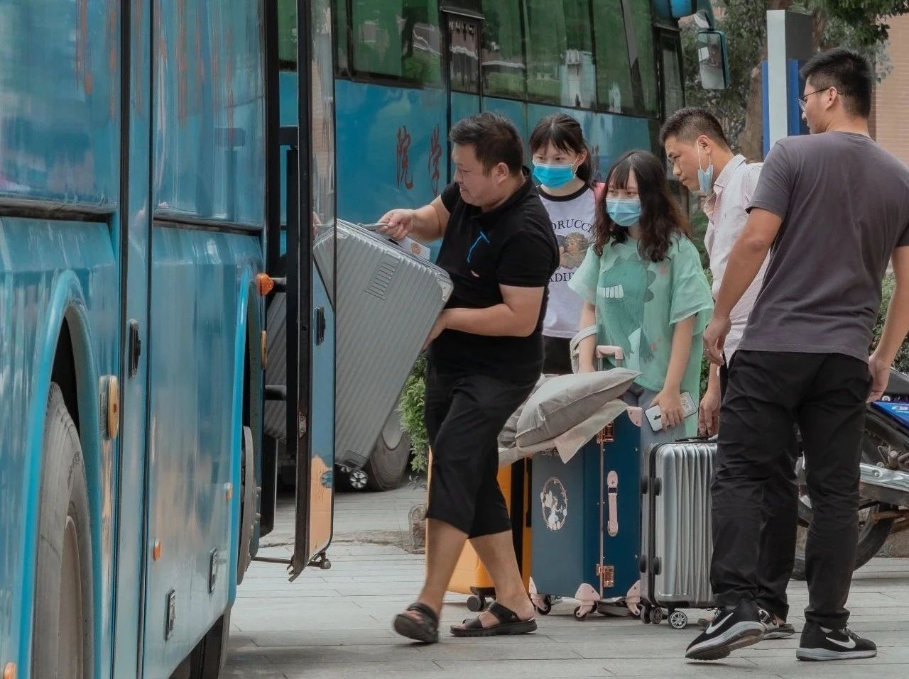 ▲辅导员帮学生将行李搬上校内摆渡车辆