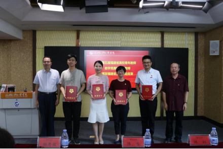 随后,出席本次活动的领导为全省第五届福建省高校青年教师教学竞赛人文社会科学组特等奖获得者蔡飞舟老师、自然科学基础学科组特等奖获得者王素云老师、自然科学应用学科组特等奖获得者林虹老师、思政组特等奖获得者陈东老师颁发五一劳动奖章。