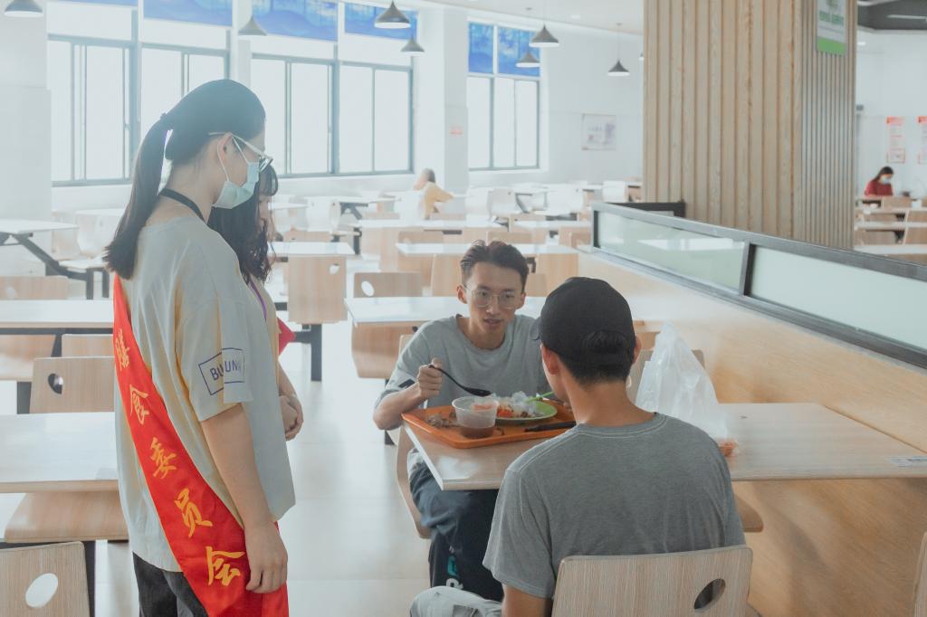 膳食管理委员会的学生,身披绶带,充当起了“节约粮食劝导员”,提醒就餐者珍惜粮食、文明就餐,养成厉行节约的良好习惯。