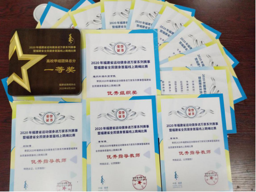 近日,2020年福建省运动健身进万家系列赛事暨福建省全民健身首届线上跳绳比赛顺利举行。我校与厦门大学并列获得高校甲组团体总分一等奖,我校荣获“优秀组织奖”,领队、教练员董海洋、童智锦、刘剑雪荣获“优秀指导教师”的荣誉称号。