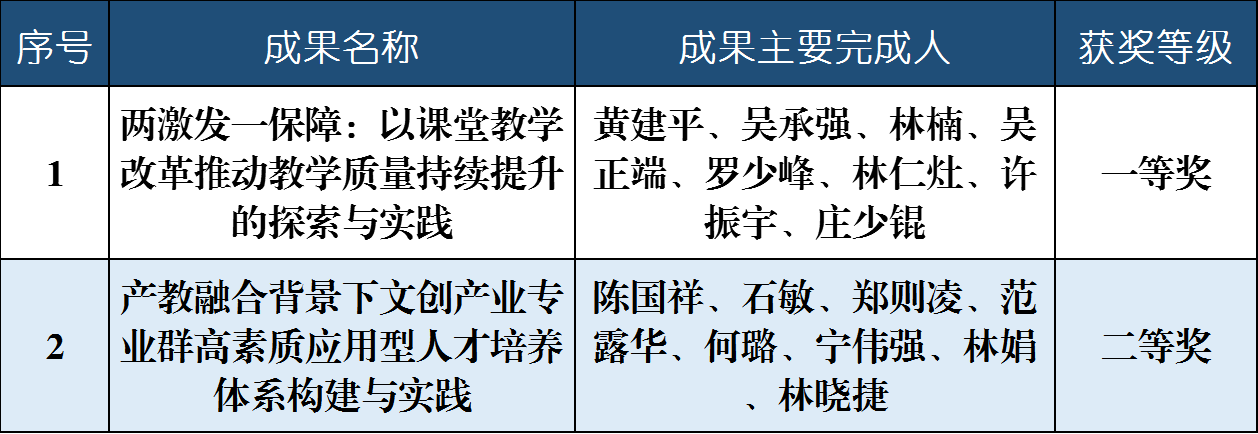 近日,福建省教育厅发布《开元网页版公布2020年高等教育省级教学成果奖获奖项目的通知》(闽教高〔2020〕24号),我校黄建平教授主持的《两激发一保障:以课堂教学改革推动教学质量持续提升的探索与实践》荣获2020年福建省高等教育教学成果奖一等奖,陈国祥教授主持的《产教融合背景下文创产业专业群高素质应用型人才培养体系构建与实践》荣获二等奖。