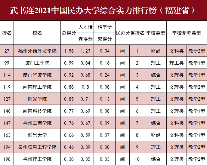 2021年4月13日,中国管理科学研究院《中国大学评价》课题组发布《武书连2021中国民办大学综合实力排行榜》,我校在2021中国民办大学综合实力榜中位列第27名,居福建省首位。