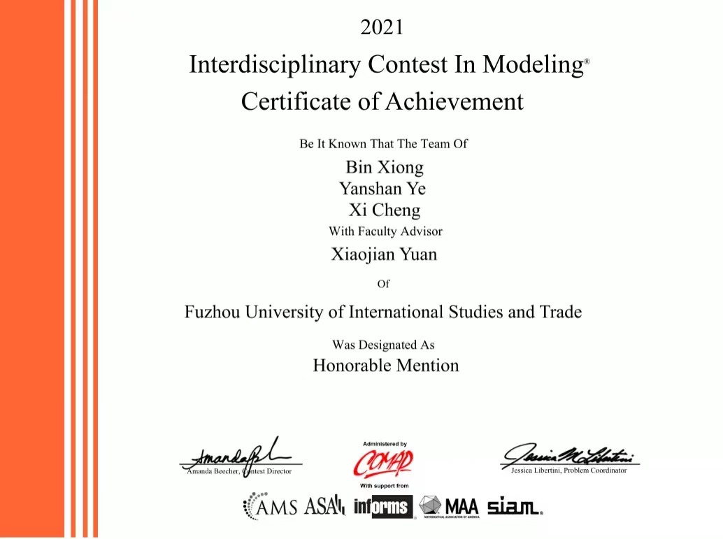 近日,2021年美国大学生数学建模竞赛获奖名单揭晓,在与来自中国、美国、澳大利亚、加拿大、英国、印度等16个国家与地区的26112支队伍(MCM 10053支、ICM 16059支)的竞争中,我校参赛队荣获二等奖(Honorable Mention)2项和三等奖(Successful Participant)44项。