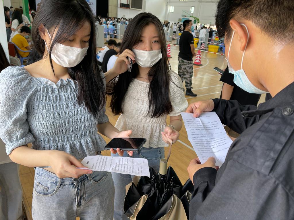 接种现场,志愿者正引导师生们排队进入预检分诊区,师生们通过手机进行疫苗接种信息预登记,并生成预登记码。医务人员仔细核对接种者身份信息,确认有无接种禁忌,并询问近期健康状况和过敏史、疾病史等,随后签署《新型冠状病毒疫苗接种知情告知书》,扫描预登记码并进入接种区注射新冠疫苗,现场秩序井然。