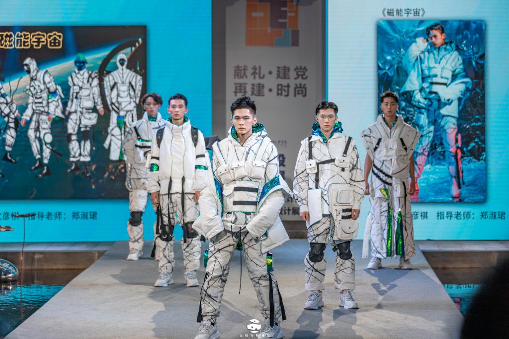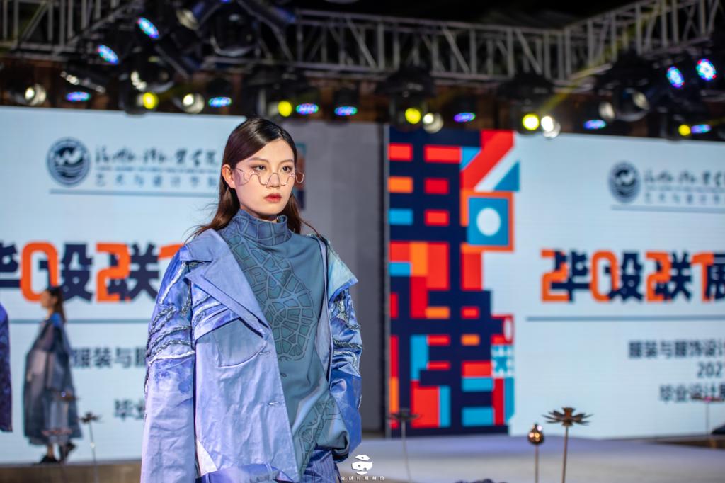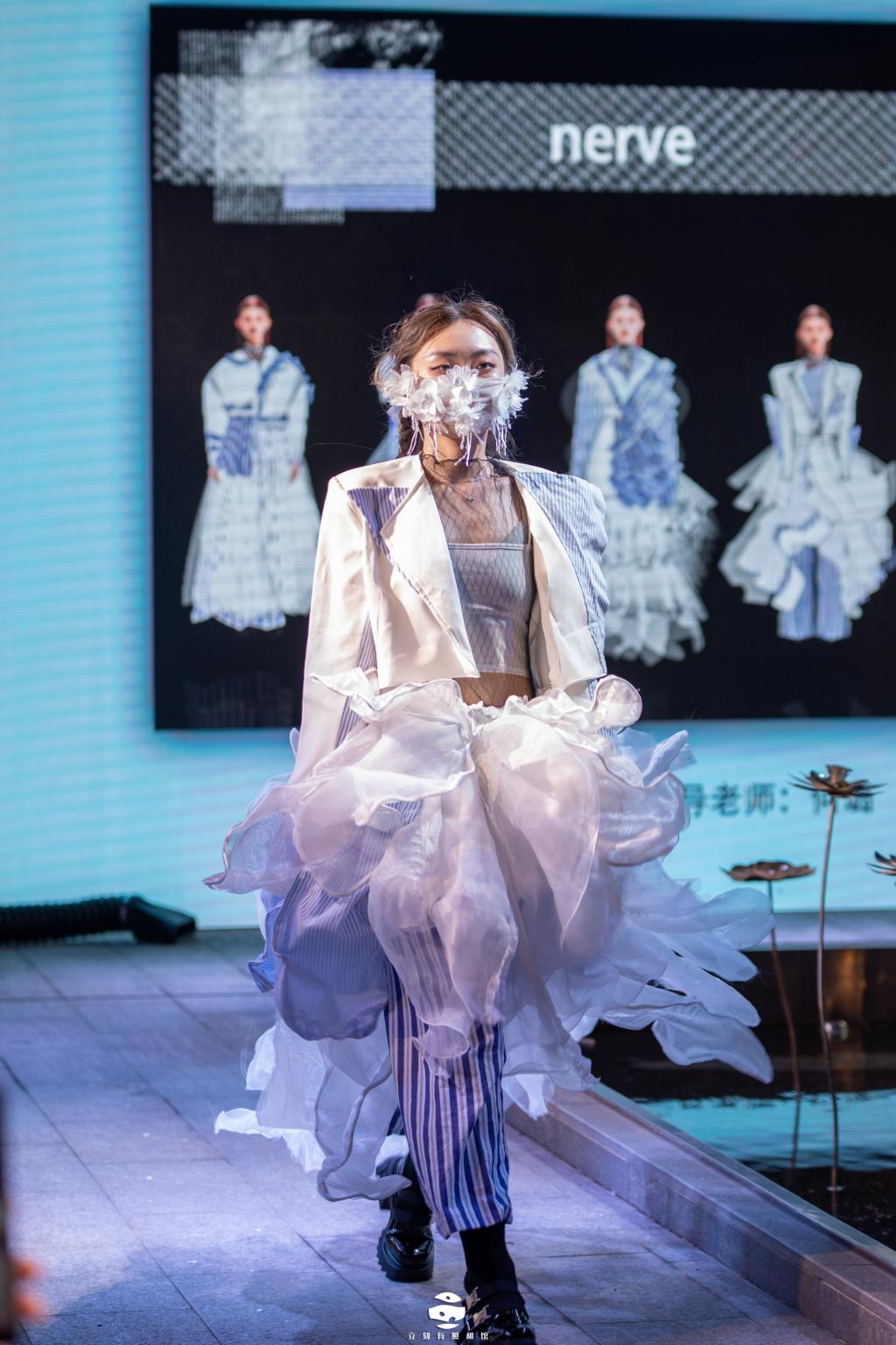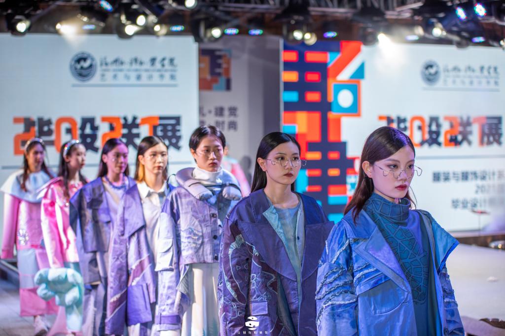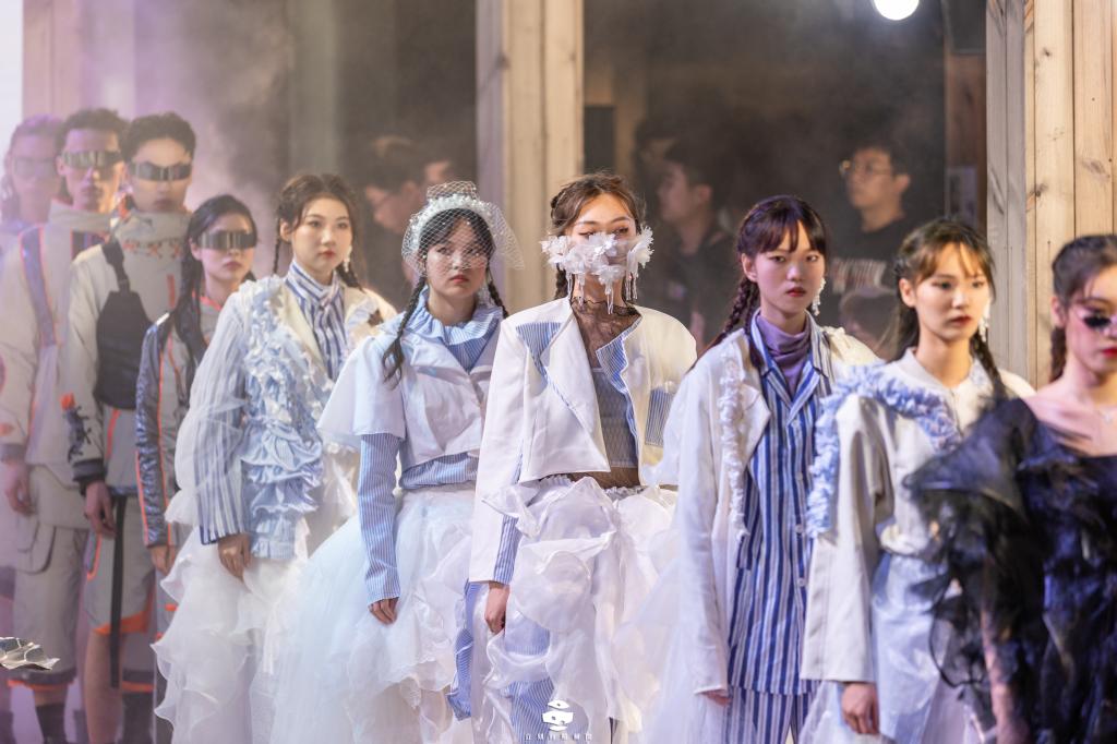 伴随着绚丽的灯光秀,服装与服饰设计系毕业展演拉开序幕,本次展演围绕“潮流起航”“未来永续”“传承创新”“再建时尚”四个主题,共展出25组125套服装作品。