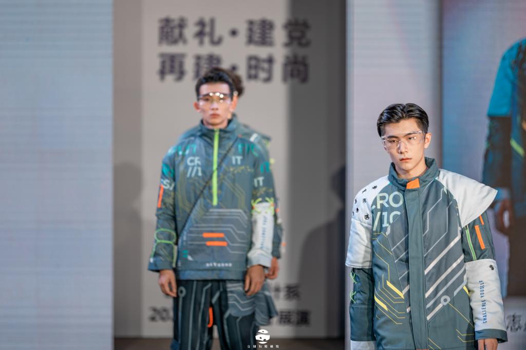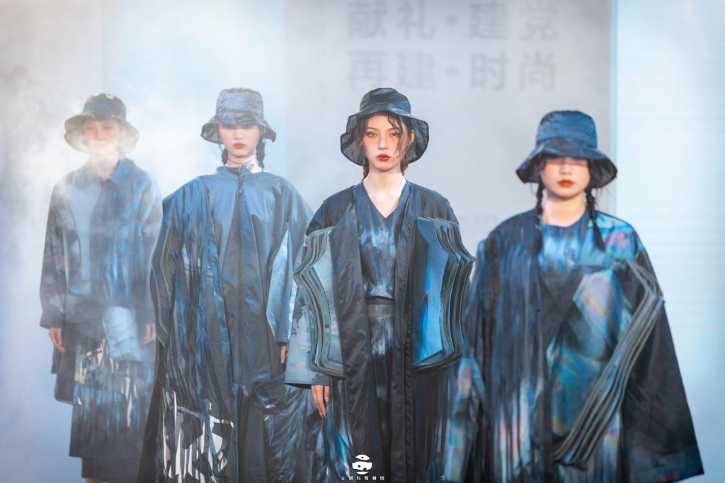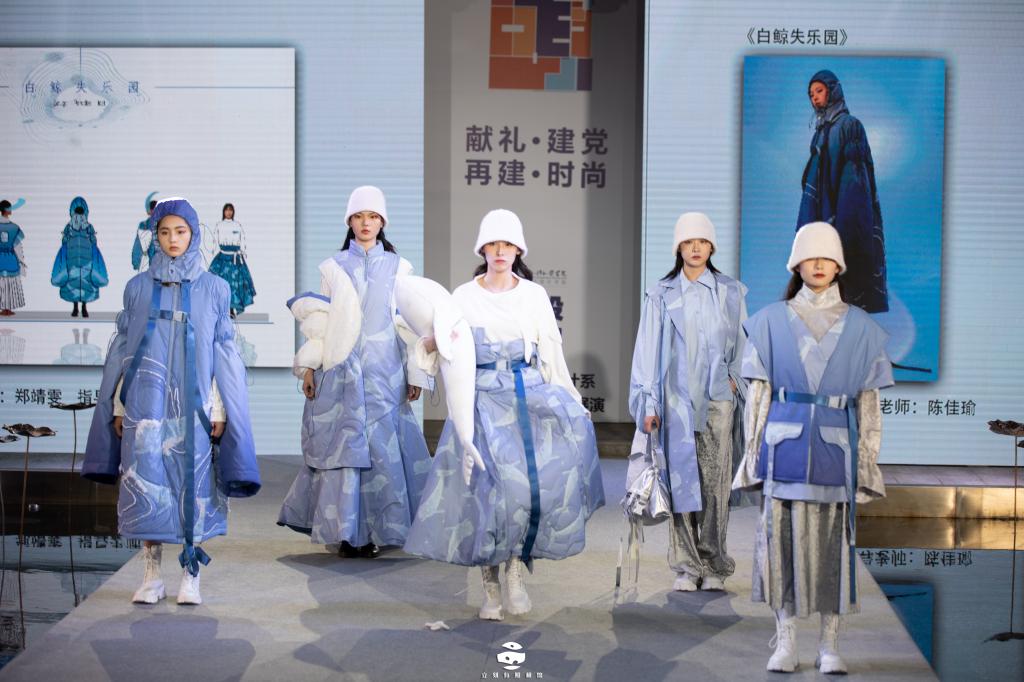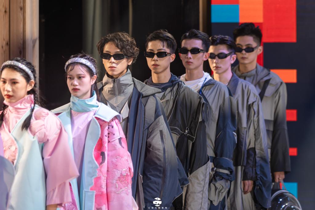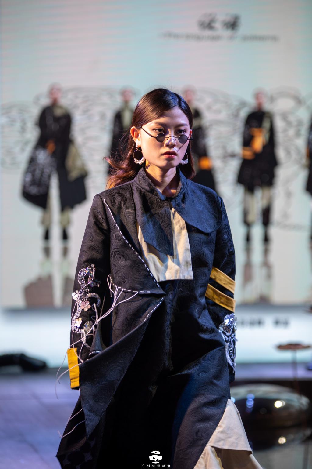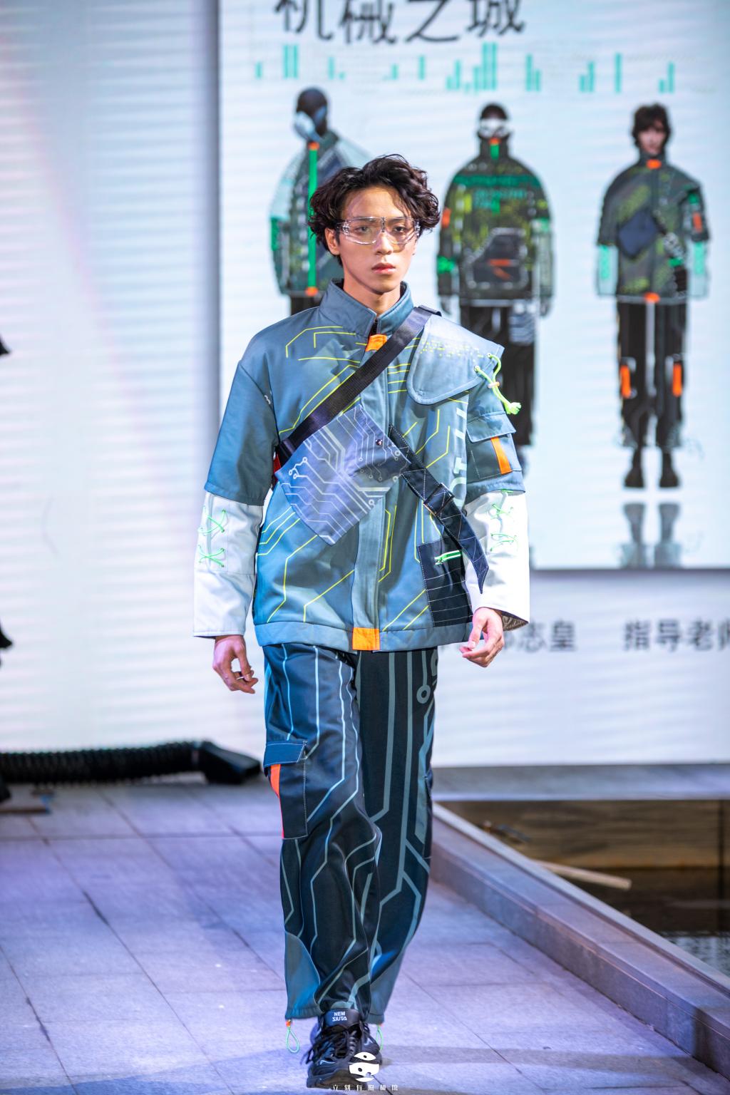 伴随着绚丽的灯光秀,服装与服饰设计系毕业展演拉开序幕,本次展演围绕“潮流起航”“未来永续”“传承创新”“再建时尚”四个主题,共展出25组125套服装作品。