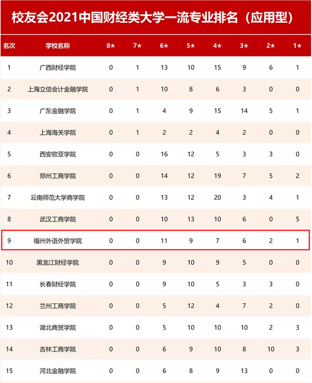 日前,艾瑞深中国校友会网最新发布2021校友会中国一流专业排名、2021福建省一流专业排名和2021福建省各学科门类一流专业排名。我校在全国财经类大学一流专业排名(应用型)中位列第9名,在福建省应用型高校一流专业排名中位列第4名,居福建省民办大学首位。其中,国际经济与贸易、法语、翻译、服装与服饰设计、财务管理、日语、物流管理、金融学、信息管理与信息系统、动画、会计学等11个专业入选6星级中国顶尖应用型专业,投资学、金融工程、广播电视编导、视觉传达设计、工程管理、电子商务、市场营销、土木工程、英语等9个专业入选5星级中国一流应用型专业。另有7个专业入选4星级专业,6个专业入选3星级专业。