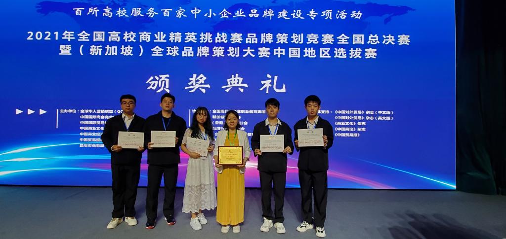 在昆明举行的2021年全国高校商业精英挑战赛品牌策划竞赛全国总决赛中,我校财金学院参赛团队(团队成员:蔡云龙、徐娟红、李玉鹏、温兆南、苏嘉宏;指导教师:林晓薇、彭雅琴)荣获二等奖。