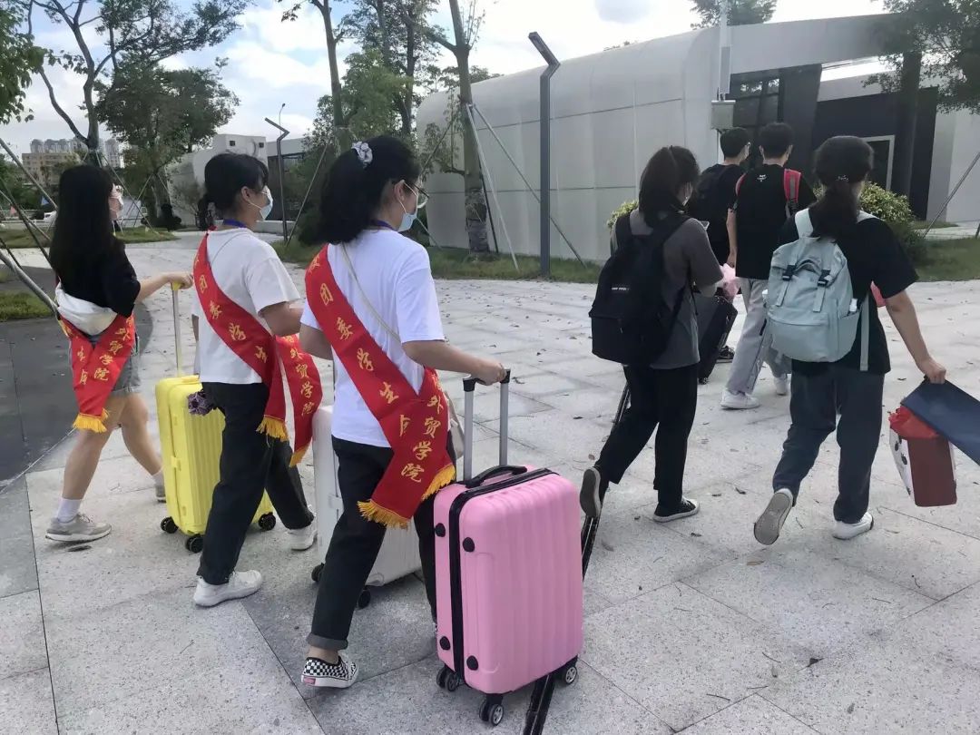 到校的新生陆续搭乘摆渡车前往宿舍区域,此时志愿者们早已等候在宿舍楼下,学长甚至学姐都化身成“大力士”,扛起新生们的行李就上楼。学生党员也活跃在迎新现场,以实际行动践行承诺。