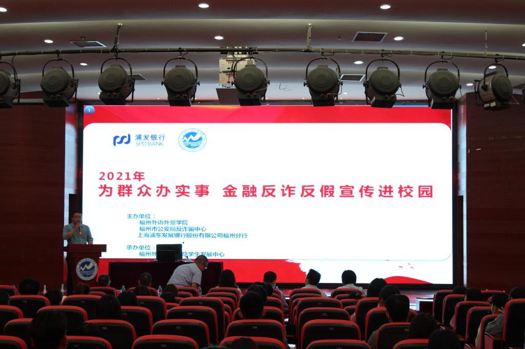 10月20日,福州市公安局反诈骗中心、浦发银行福州分行到我校开展“为群众办实事 金融反诈反假宣传进校园”系列活动,通过报告讲座、校区宣传、线上直播等形式,对全校师生进行了金融反诈、反假宣讲。