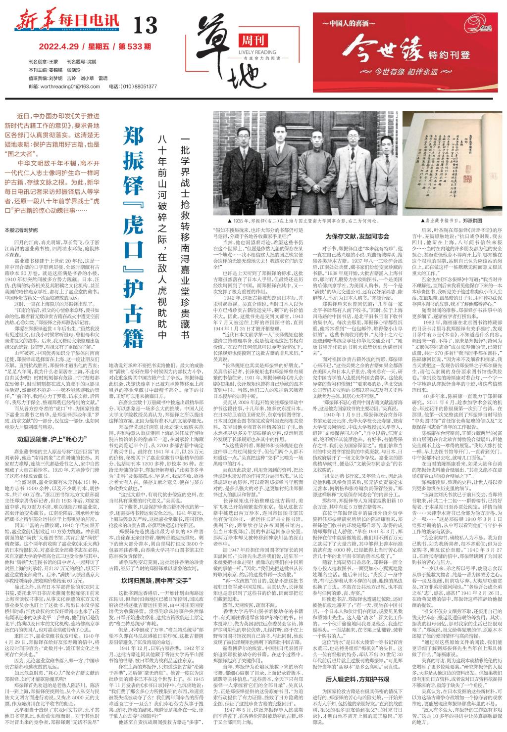 4月29日,国内主流媒体新华每日电讯以郑振铎“虎口”护古籍为题,整版报道了郑振铎等爱国学者抢救转移珍贵藏书的动人往事,文章多次大篇幅提及我校郑振铎与闽海文化研究中心陈福康教授致力于郑振铎研究的辛勤体会和切身感受。在文章中,作者讲述了陈福康教授长期搜集、整理郑振铎相关史料的过程,并以陈福康的亲身体会带领读者们了解前人“护书”的艰辛历程。