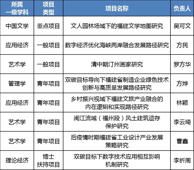 据悉,本次公布的2022年度福建省社会科学基金立项项目共计410项,其中,重点项目21项,一般项目162项,青年项目102项,西部扶持项目25项,台胞专项扶持项目20项,博士扶持项目80项。本次立项研究主要聚焦福建经济社会发展的重大理论和实践问题,旨在推出具有现实性、针对性和较强决策参考价值的研究成果。