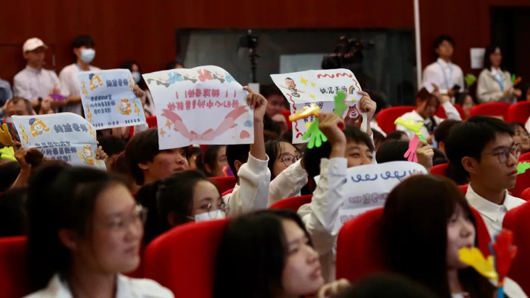 现场的学生代表挥舞着手中的举牌