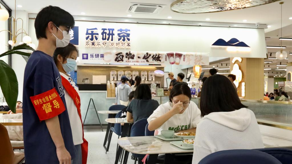 膳食管理委员会的学生,充当起“节约粮食劝导员”,提醒就餐者珍惜粮食、拒绝浪费,养成光盘行动的良好习惯。
