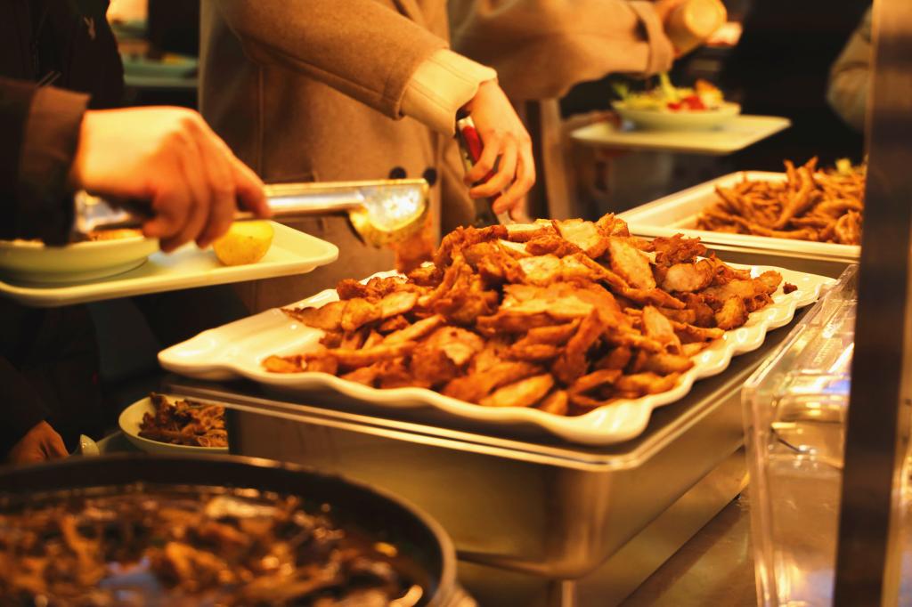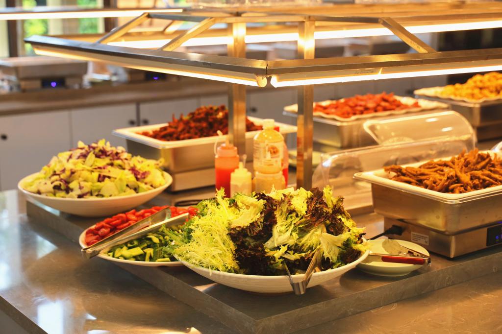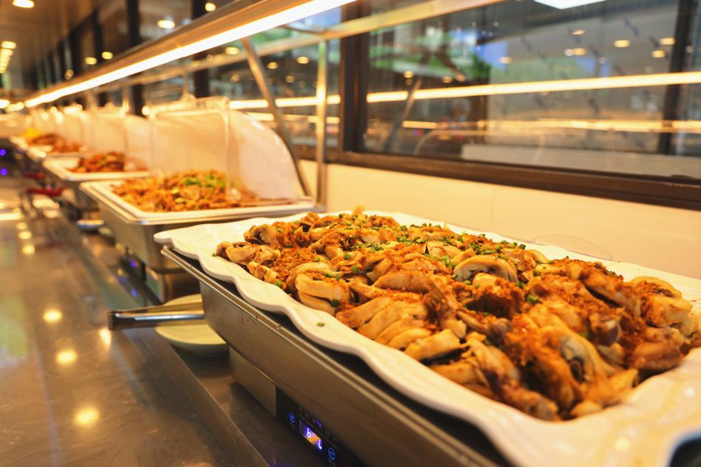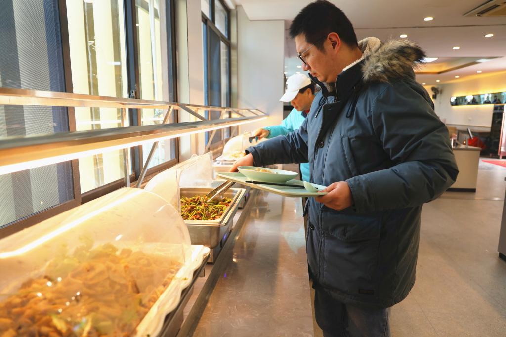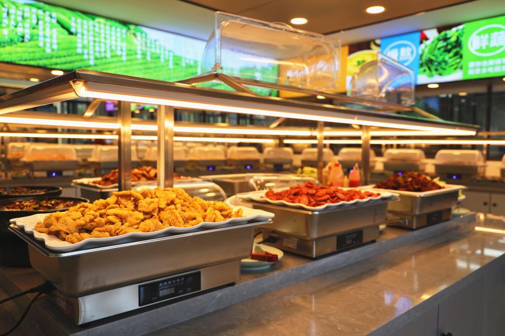 取餐区,暖色的灯光照在一道道新鲜出炉的菜品上,不禁令人食指大动。现场工作人员介绍:“食堂早、午、晚每餐供应多种菜品,尤其午餐和晚餐有多达30余种菜品可供选择,教职工均可免费自助取餐。”