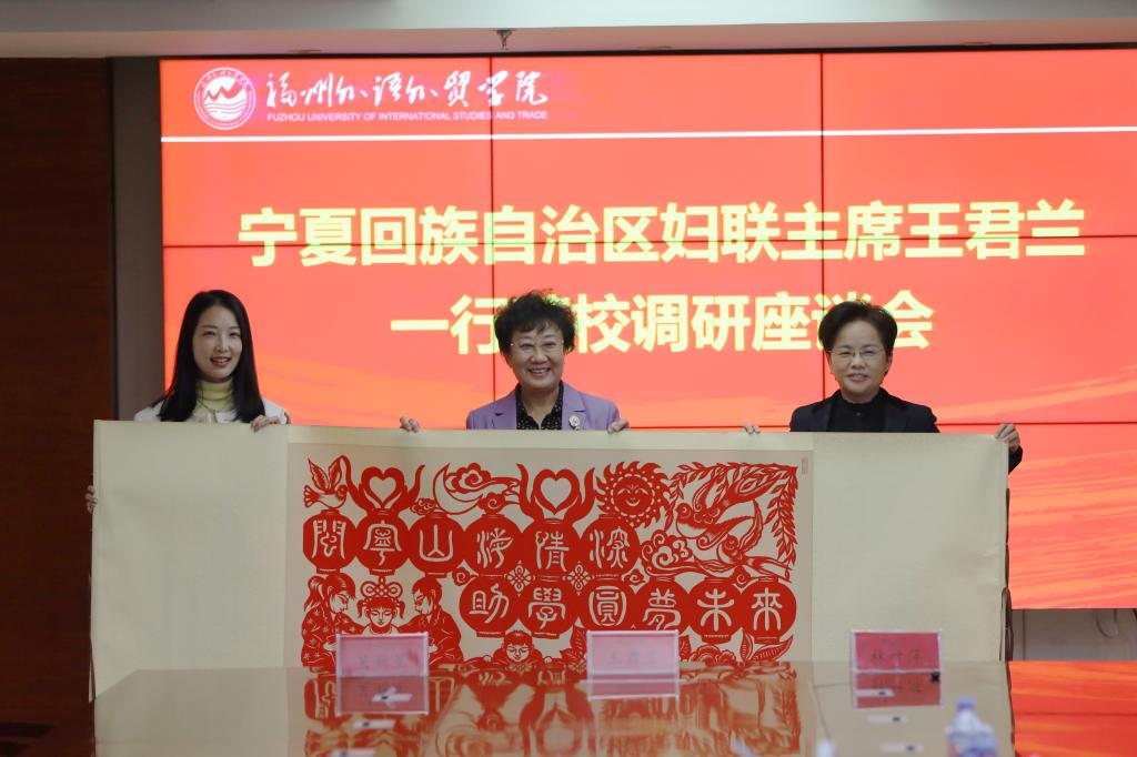 3月13日,宁夏回族自治区妇联主席王君兰一行莅临我校调研,看望慰问了我校宁夏籍女大学生,并与她们座谈交流。福建省妇联主席林叶萍、副主席卓晓銮陪同调研。我校董事长吴新星、执行校长黄建平接待了来宾。