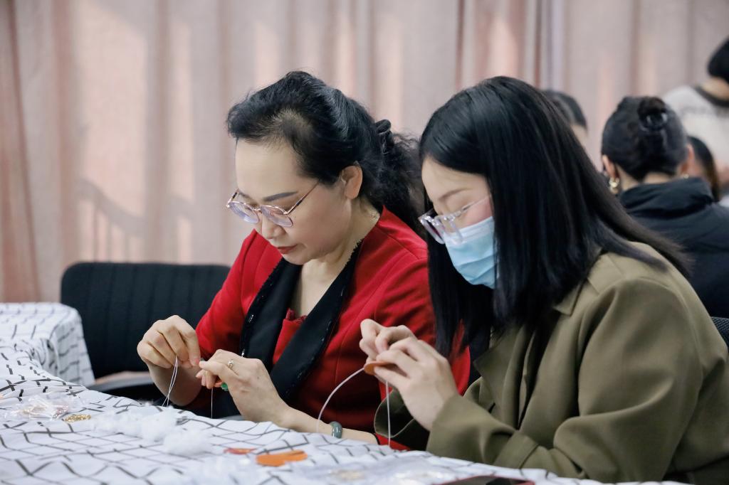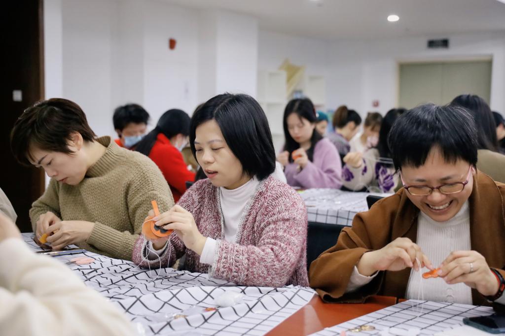 几片皮料、几条细线,在女同胞们手上瞬间就变成了各种造型精美的皮具挂饰。在制作过程中,大家相互交流、相互协作,气氛融洽美好。