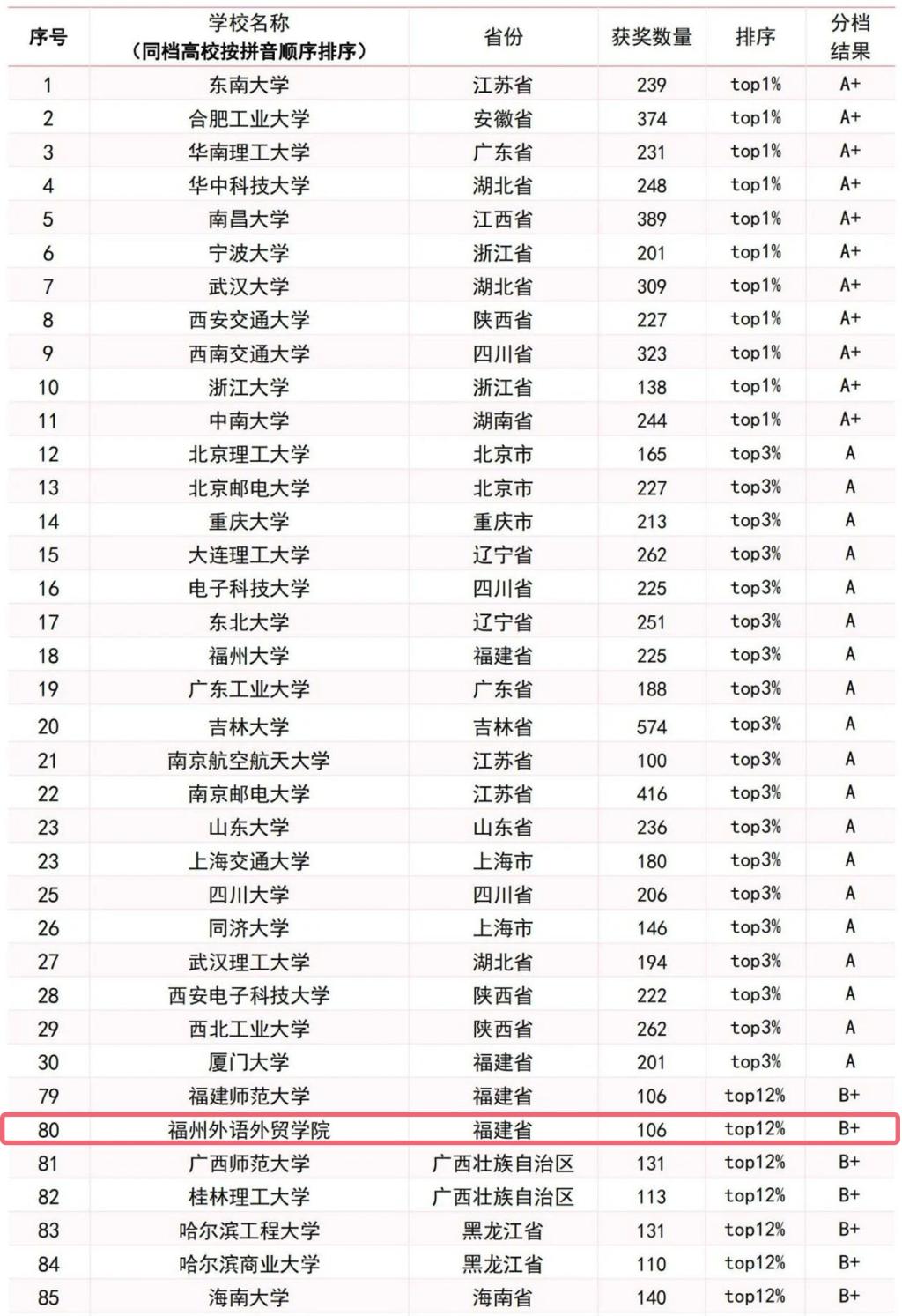 4月8日,《全国普通高校创新创业类竞赛研究报告》(以下简称《研究报告》)正式发布。《研究报告》中“2012-2022 年全国普通高校大学生创新创业类竞赛状态数据”显示,我校位列第80名,获奖数106项,跻身全国top12%行列。在福建省内,我校排名仅次于福州大学、厦门大学、福建农林大学,与福建师范大学并列第4位,稳居省内民办高校首位。
