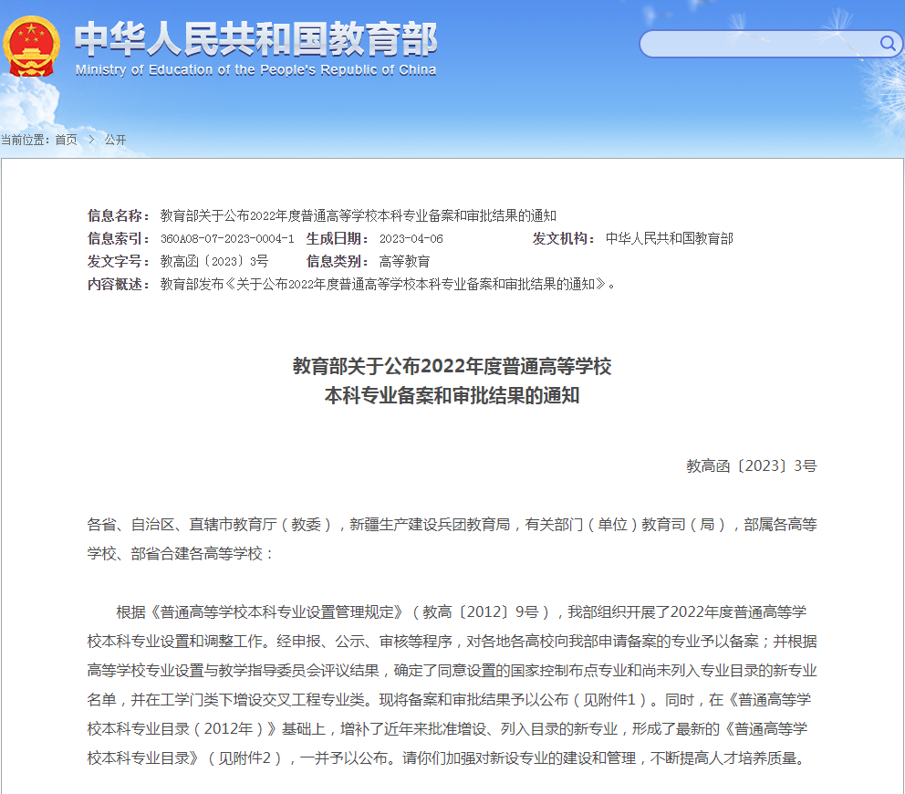 日前,教育部发布《开元网页版公布2022年度普通高等学校本科专业备案和审批结果的通知》(教高函〔2023〕3 号),我校获批数字经济专业、网络与新媒体专业和人工智能专业等3个新专业。至此,我校本科专业已增至39个,涵盖经济学、教育学、文学、工学、管理学、艺术学等6大学科门类。
